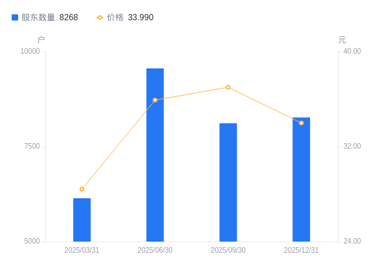 3月5日消息,数据显示,截至2025年12月31日,A股股东总户数为8268户,较上期(2025年9月30日)增加154户,增幅1.90%。公司最新A股总股本为1.17亿股,其中流通A股1.04亿股,户均持有流通A股数量为1.25万股,较上期减少238.18股,降幅1.86%;户均持流通A股市值42.65万元,较上期减少4.66万元,降幅9.85%。