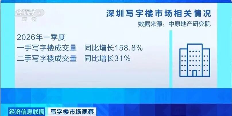 数据显示,2026年一季度,深圳一手写字楼成交量,同比增长158.8%;二手写字楼成交量,同比增长31%。