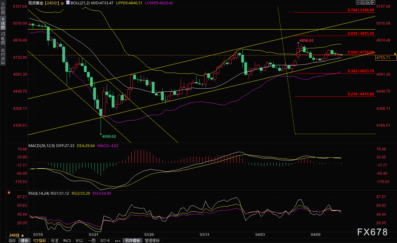 在全球金融市场持续震荡的背景下,现货黄金价格近日再度面临调整压力。尽管周四(4月9日)一度试图冲击4800美元重要心理关口,但最终未能成功突破,随后吸引了新一轮卖盘入场。周五(4月10日)亚洲交易时段,一度下滑至4738美元附近区域。目前,现货黄金交投于4755美元/盎司左右,跌幅约为0.2%。尽管出现小幅回落,但贵金属整体仍维持在熟悉的震荡区间内运行,市场参与者正高度关注即将公布的美国最新消费者物价指数(CPI)数据,以期从中获取更清晰的交易方向指引。