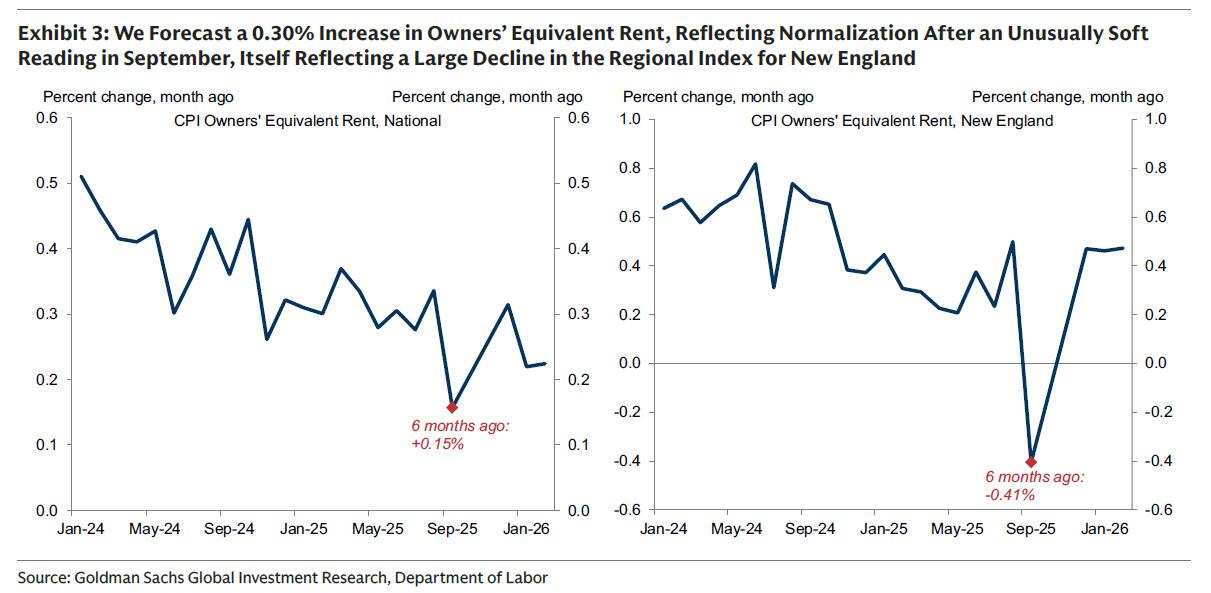 ②住房。高盛预测租金类别将环比增长0.20%,表现温和,反映出其潜在趋势的持续放缓。高盛预测业主等价租金(OER)类别将加速攀升至0.30%,反映出9月异常疲软读数反弹带来的上行压力,而该读数本身反映了新英格兰地区OER指数的较大幅度下降。