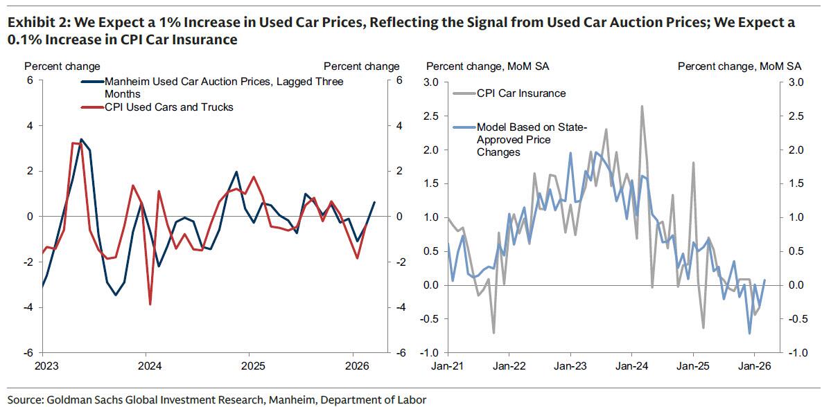 ①汽车。高盛认为,汽车通胀预计将参差不齐,反映出二手车价格根据二手车拍卖价格信号上涨1%;新车价格持平,反映出新车销售激励措施基本未变;以及汽车保险价格上涨0.1%,反映出高盛的在线数据集所指示的保费上涨。