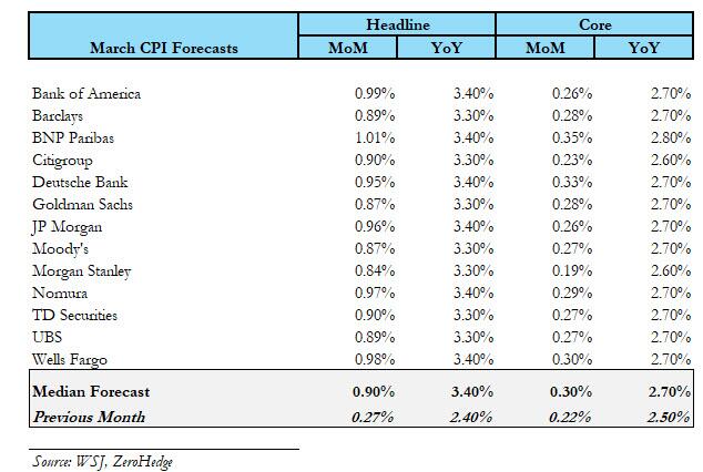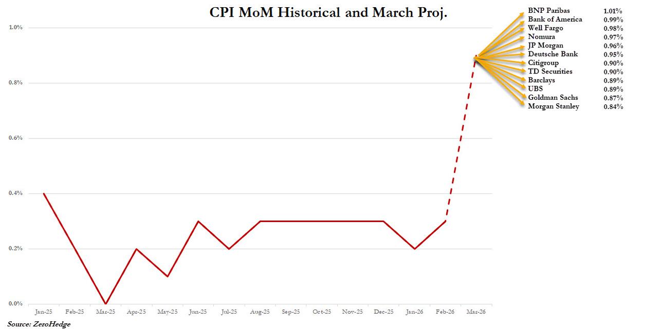 下图是目前华尔街投行对3月CPI环比数据的具体预测。可以看到,投行预估分布普遍在0.8%以上,部分机构预测环比涨幅可能“破1%”。