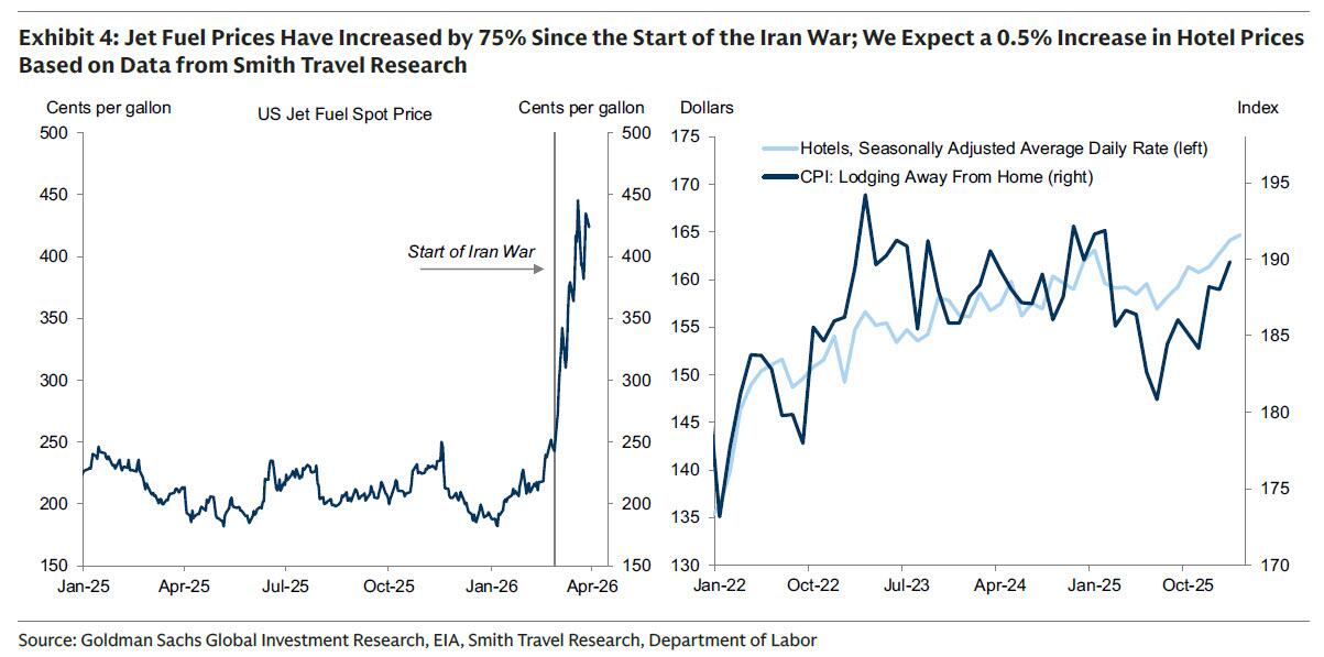 ③旅游服务。高盛预计3月旅游服务通胀强劲,部分反映了自伊朗战争开始以来油价上涨的传导效应。高盛预测机票价格环比上涨4%,部分反映了航空燃料价格的大幅上涨,以及3月酒店价格环比上涨0.5%,反映了替代价格数据的上升信号。