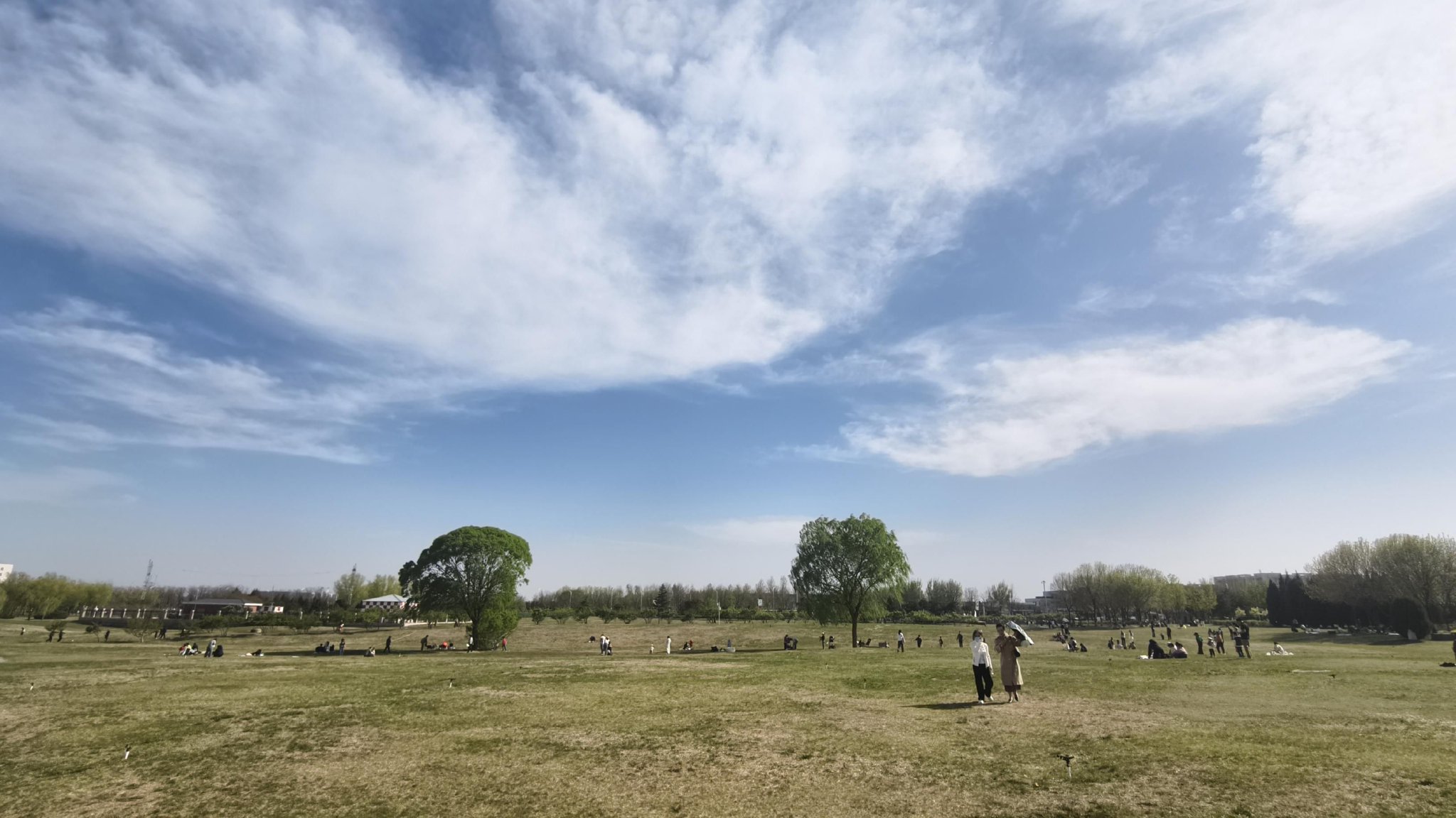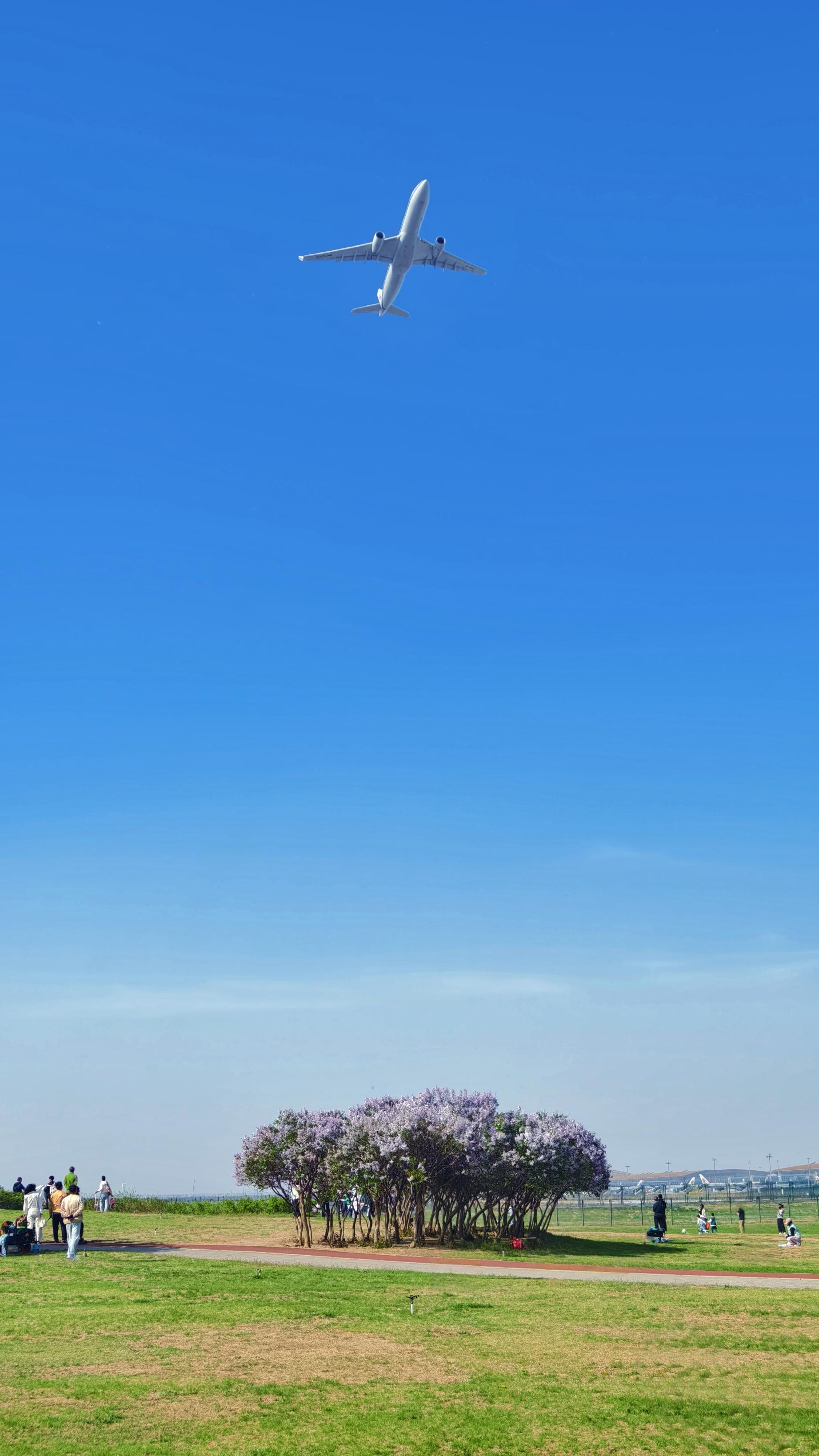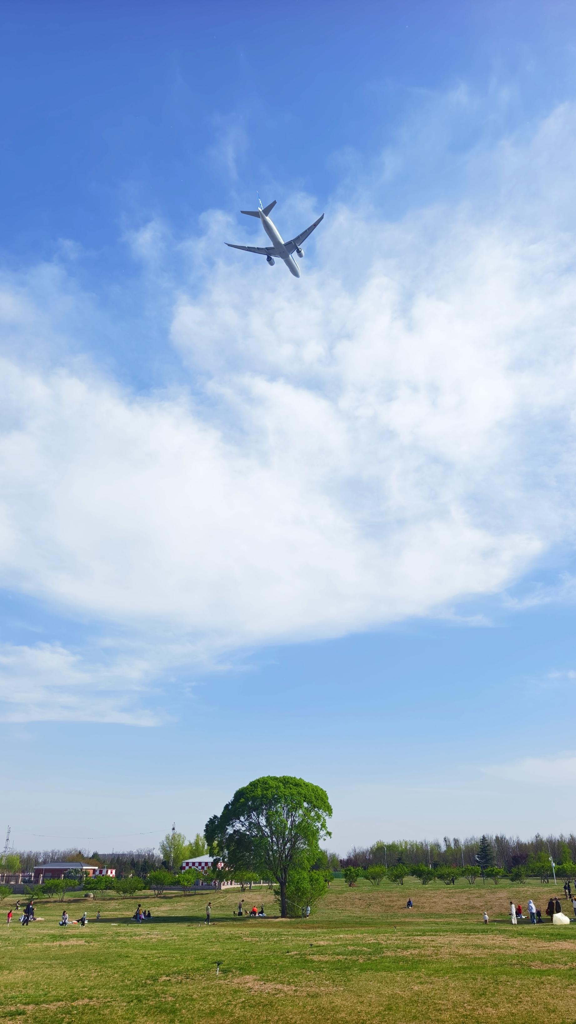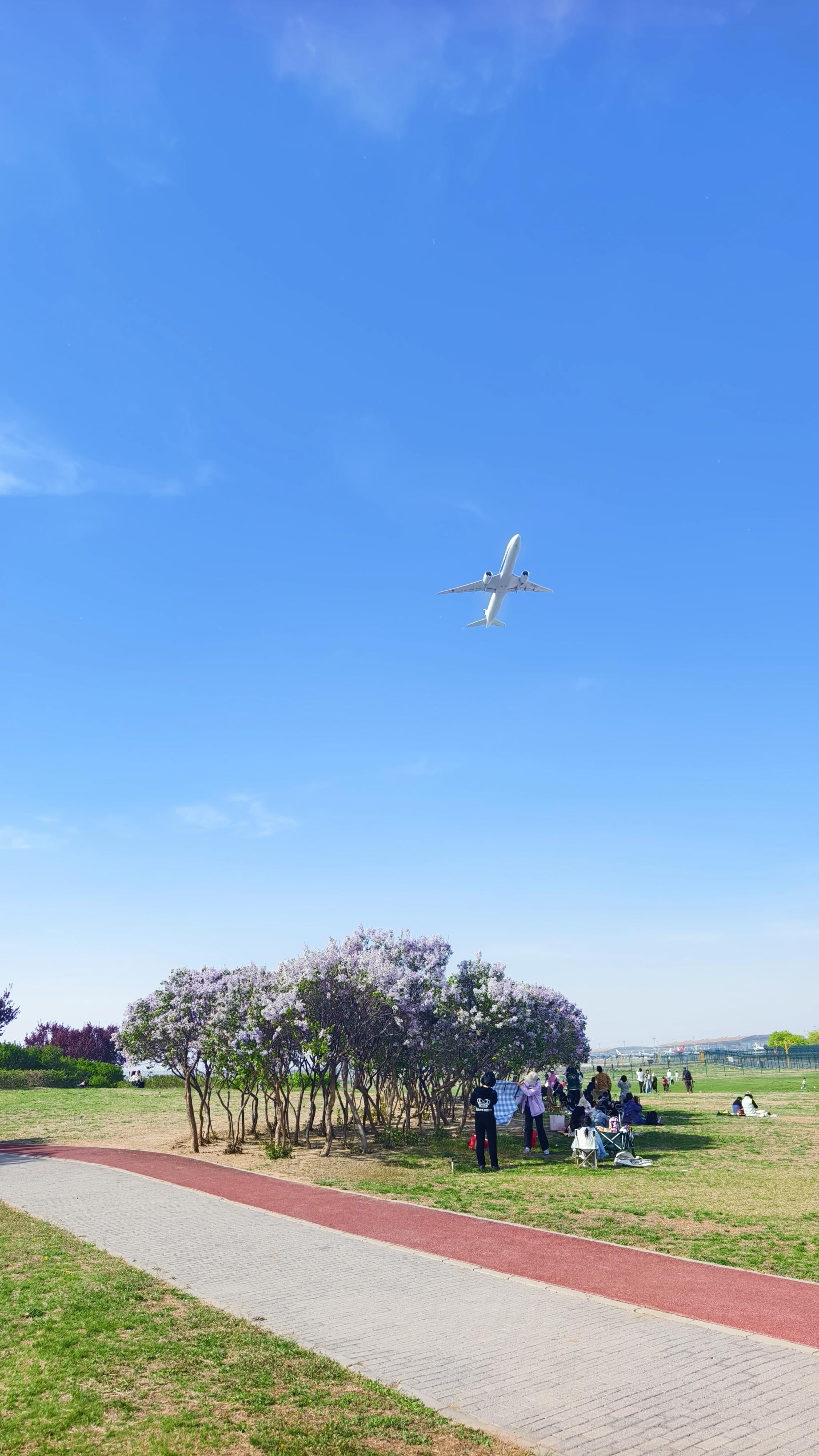 4月11日,北京晴空如洗,花团锦簇,草坪上游人悠然,一架客机掠过。