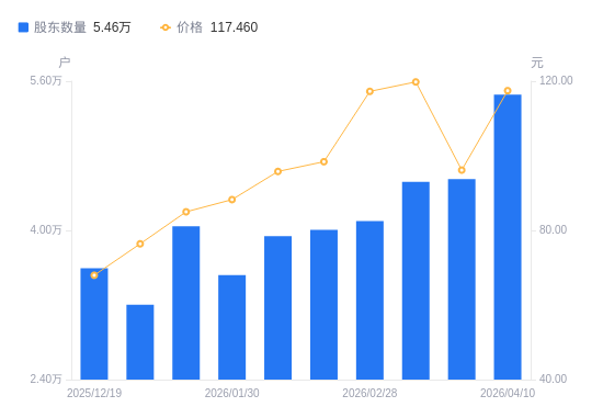 4月12日消息,数据显示,截至2026年4月10日,A股股东总户数为5.46万户,较上期(2026年3月20日)增加9083户,增幅19.97%。公司最新A股总股本为10.24亿股,其中流通A股6.93亿股,户均持有流通A股数量为1.27万股,较上期减少2536.83股,降幅16.64%;户均持流通A股市值149.22万元,较上期增加2.67万元,增幅1.82%。