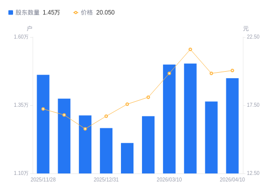 4月13日消息,数据显示,截至2026年4月10日,A股股东总户数为1.45万户,较上期(2026年3月31日)增加855户,增幅6.27%。公司最新A股总股本为4亿股,其中流通A股1.64亿股,户均持有流通A股数量为1.13万股,较上期减少710.22股,降幅5.90%;户均持流通A股市值22.71万元,较上期减少1.17万元,降幅4.90%。