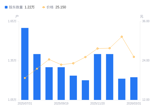 4月13日消息,数据显示,截至2025年11月20日,A股股东总户数为1.4万户,较上期(2025年10月31日)增加2000户,增幅16.67%。公司最新A股总股本为2.4亿股,其中流通A股2.4亿股,户均持有流通A股数量为1.71万股,较上期减少2851.98股,降幅14.29%;户均持流通A股市值47.4万元,较上期减少2.69万元,降幅5.37%。