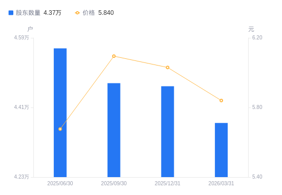 4月17日消息,数据显示,截至2025年12月31日,A股股东总户数为4.46万户,较上期(2025年9月30日)减少81户,降幅0.18%。公司最新A股总股本为15.52亿股,其中流通A股14.49亿股,户均持有流通A股数量为3.25万股,较上期增加58.79股,增幅0.18%;户均持流通A股市值19.57万元,较上期减少1751.68元,降幅0.89%。