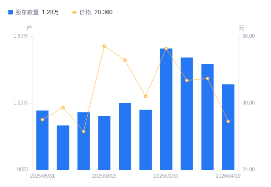 4月17日消息,数据显示,截至2026年4月10日,A股股东总户数为1.28万户,较上期(2026年2月27日)减少919户,降幅6.68%。公司最新A股总股本为4亿股,其中流通A股4亿股,户均持有流通A股数量为3.11万股,较上期增加2078.94股,增幅7.15%;户均持流通A股市值88.31万元,较上期减少5.29万元,降幅5.65%。