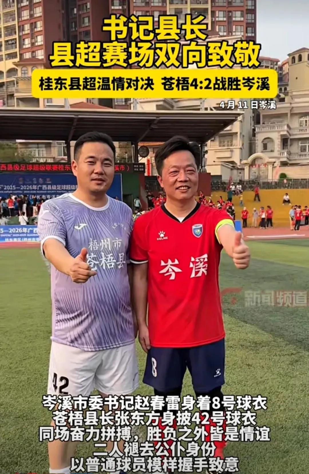 战报显示,4月11日下午岑溪队对阵苍梧队的梧州德比成为焦点,岑溪市委书记赵春雷身披8号球衣、苍梧县县长张东方身着42号球衣,双双以球员身份亮相赛场,与队员并肩作战、全力拼抢,为全民健身作出生动示范。比赛中,张东方还送上了一记助攻。