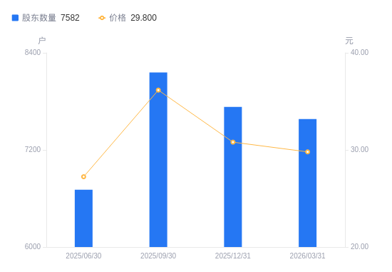 4月21日消息,数据显示,截至2026年3月31日,A股股东总户数为7582户,较上期(2025年12月31日)减少150户,降幅1.94%。公司最新A股总股本为1.37亿股,其中流通A股1.37亿股,户均持有流通A股数量为1.81万股,较上期增加350.8股,增幅1.98%;户均持流通A股市值53.89万元,较上期减少7277.86元,降幅1.33%。