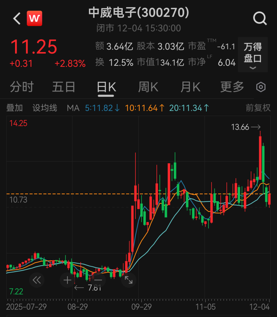 12月4日,中威电子股价以11.25元/股报收,最新市值为34.1亿元。