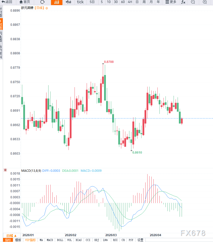 最新数据显示,英国3月消费者价格指数(CPI)同比升至3.3%,高于前值3.0%,反映出能源价格上涨对通胀的传导效应正在显现。尽管核心通胀略低于预期,但整体通胀水平回升,强化了市场对英国央行维持紧缩政策的预期。这一变化对英镑形成支撑,从而限制EUR/GBP的上行空间。从政策角度来看,英国央行预计将在下一次会议上维持利率在3.75%不变,但通胀反弹使市场开始重新评估未来政策路径。部分投资者认为,若通胀持续高于目标水平,不排除延后降息甚至重新加息的可能性。这种预期变化为英镑提供中期支撑。