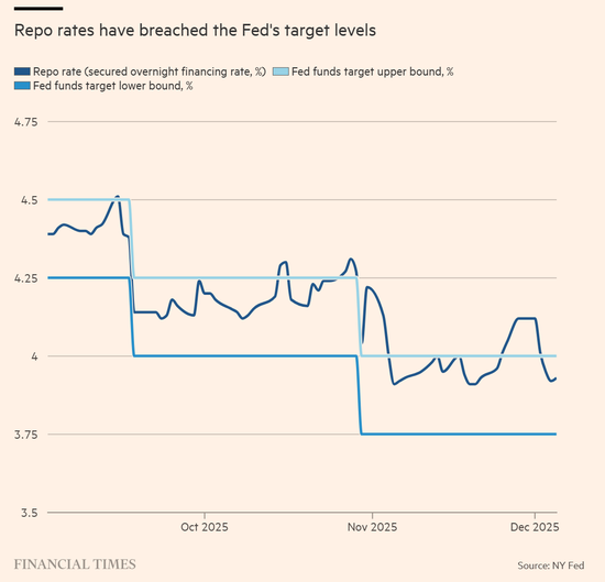 今年10月,为应对回购市场日益加剧的压力,美联储宣布将到期国债和抵押贷款支持债券的本金,重新投资于短期国库券。但这一举措并未完全奏效:隔夜利率频繁突破美联储目标区间,银行持续依赖央行的流动性支持工具——常备回购便利工具(standing repo facility)。