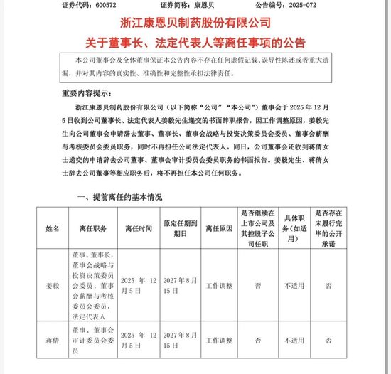 根据康恩贝公告,公司董事长、法定代表人姜毅因工作调整原因,申请辞去董事、董事长、董事会战略与投资决策委员会委员、董事会薪酬与考核委员会委员职务,同时不再担任公司法定代表人。此外,董事、董事会审计委员会委员蒋倩也递交了辞呈,两人原定任期均至2027年8月15日。