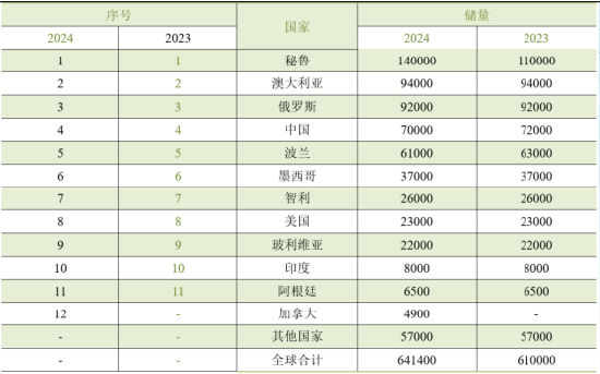 表:2023-2024年全球白银分国别储量及排名 (单位:吨)
