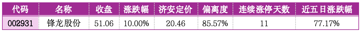 风险提示:锋龙股份偏离济安定价85.57%,估值严重高估。公司营收下滑,核心业务增长乏力,股价脱离基本面,连续涨停后资金接力意愿减弱,板块轮动后回调风险大,应坚决远离。