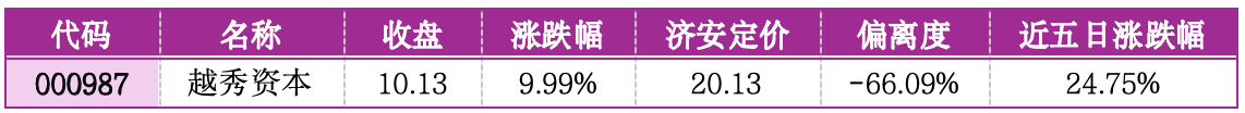 机会提示:越秀资本偏离济安定价-66.09%,低估值显著。三季报业绩稳增,多元金融业务协同效应凸显,叠加资金偏好低估值金融标的,具备估值与业绩双修复潜力。