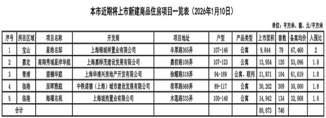 2026年1月10日,上海迎来本年度首批新房过会。本次共有5个项目即将入市,总计推出746套房源,分布于宝山、嘉定、青浦、临港。