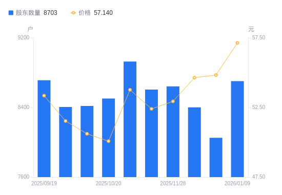 1月14日消息,数据显示,截至2025年12月19日,A股股东总户数为8052户,较上期(2025年12月10日)减少349户,降幅4.15%。公司最新A股总股本为4000万股,其中流通A股3043.03万股,户均持有流通A股数量为3779.22股,较上期增加157股,增幅4.33%;户均持流通A股市值20.72万元,较上期增加9296.48元,增幅4.70%。