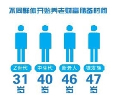经《白皮书》编制团队测算,Z世代、中生代、新老人、银发族开始养老财富储备的平均年龄分别为31岁、40岁、46岁和47岁。