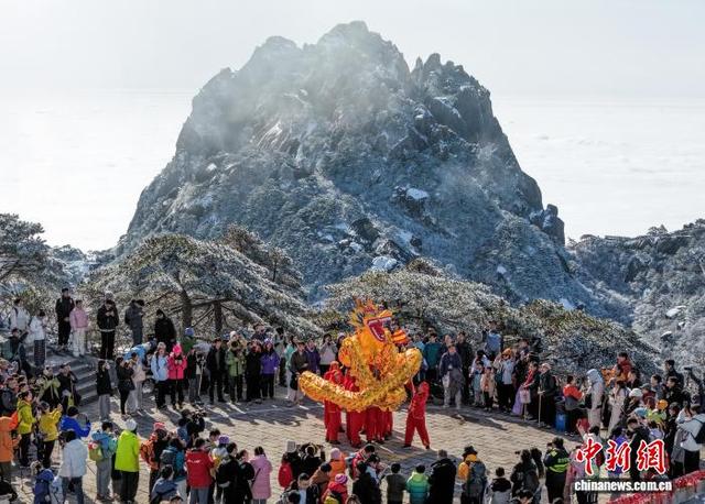 2月1日,雪后初霁的安徽省黄山风景区银装素裹,民俗舞龙在雪山之巅舞动,传统民俗与雪景相映成趣,吸引众多游客围观互动。(无人机照片)施亚磊 摄