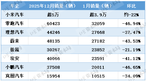 红星资本局2月1日消息,新势力车企陆续公布1月销量,较2025年12月都出现较大幅度下滑。8家新势力车企中,有4家跌幅超40%,2家跌幅超30%,2家跌幅超20%。小米汽车超越零跑汽车,以超3.9万台的销量成为新势力车企销冠。