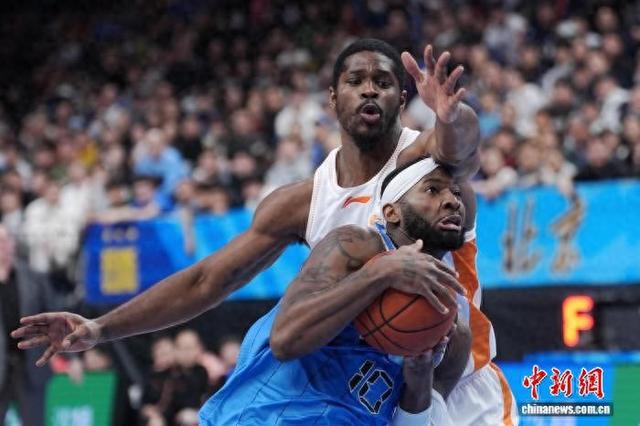 2月3日,2025-2026赛季中国男子篮球职业联赛(CBA)常规赛,北京北汽队主场85:77战胜福建晋江文旅队。图为北京北汽队杰曼(蓝衣)带球突破。 中新社记者 张祥毅 摄