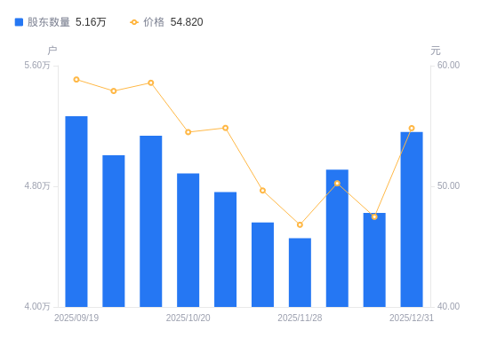2月5日消息,数据显示,截至2026年1月9日,A股股东总户数为4.9万户,较上期(2025年12月31日)减少2638户,降幅5.11%。公司最新A股总股本为4.47亿股,其中流通A股4.47亿股,户均持有流通A股数量为9125.75股,较上期增加466.58股,增幅5.39%;户均持流通A股市值50.47万元,较上期增加3万元,增幅6.33%。
