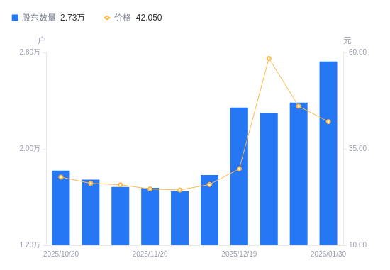 2月5日消息,数据显示,截至2026年1月30日,A股股东总户数为2.73万户,较上期(2026年1月20日)增加3415户,增幅14.32%。公司最新A股总股本为1.09亿股,其中流通A股6952.52万股,户均持有流通A股数量为2550.82股,较上期减少365.38股,降幅12.53%;户均持流通A股市值10.73万元,较上期减少2.7万元,降幅20.13%。