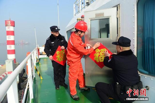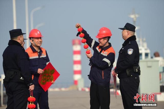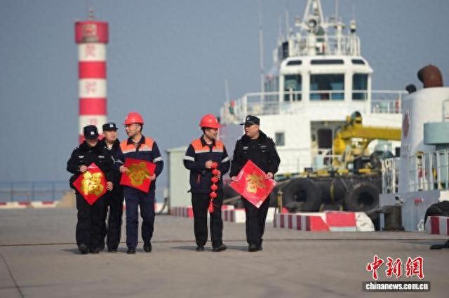 2月15日,在河北省黄骅港,河北省公安厅海防管理总队沧州支队骅港海防派出所民警坚守岗位,对码头、船舶进行安全检查,排查隐患,保障电煤运输有序进行。同时,民警们带着“福”字和红灯笼登上船头,与船员一起布置装饰,让漂泊在外的船员感受到新春的温暖与年味。图为民警带着“福”字、红灯笼,在黄骅港看望船员。傅新春 摄