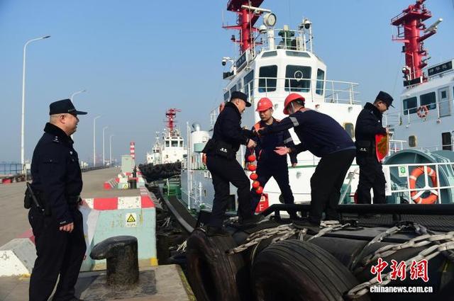 2月15日,在河北省黄骅港,河北省公安厅海防管理总队沧州支队骅港海防派出所民警坚守岗位,对码头、船舶进行安全检查,排查隐患,保障电煤运输有序进行。同时,民警们带着“福”字和红灯笼登上船头,与船员一起布置装饰,让漂泊在外的船员感受到新春的温暖与年味。图为民警登船检查并看望船员。傅新春 摄
