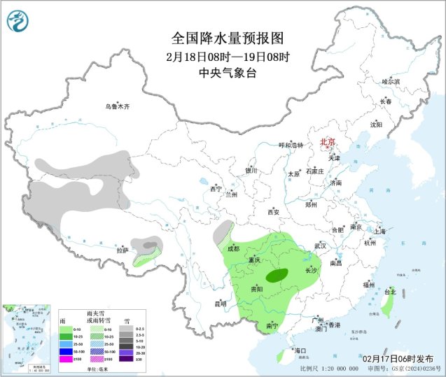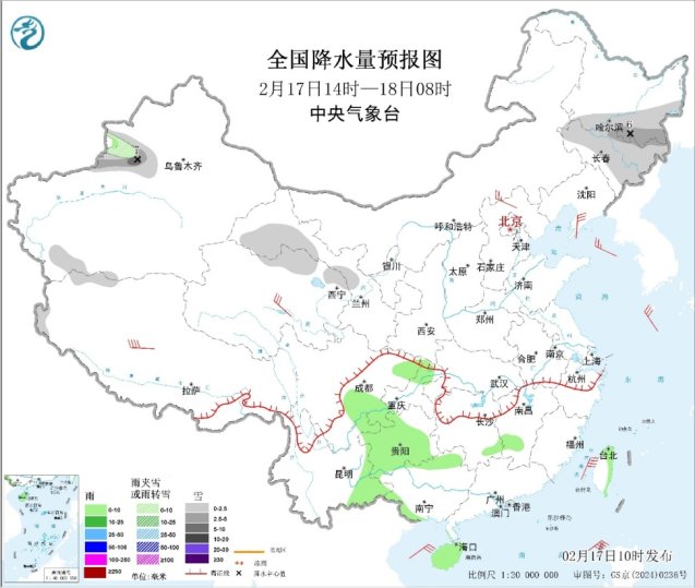 图1 全国降水量预报图(2月17日14时-18日08时)