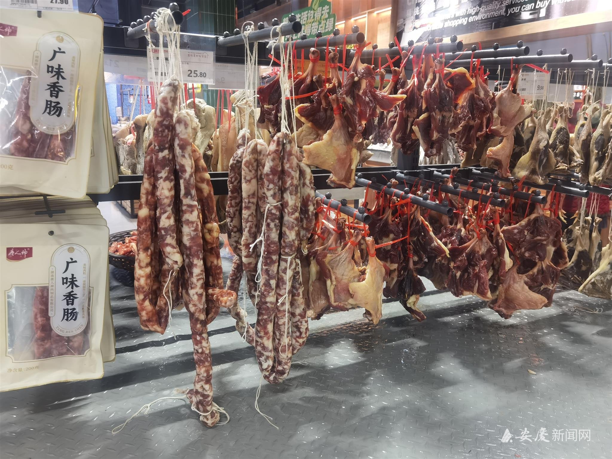 腊味区则呈现出另一种视觉冲击。货架上分类悬挂着广式腊肠、川味腊肉和湖南腊肉,油润的琥珀色在灯光下泛着光泽。工作人员一边整理一边补货。据介绍,今年腊味消费呈现分化趋势:传统整块腊肉销量平稳,而腊肠销量增长近五成。