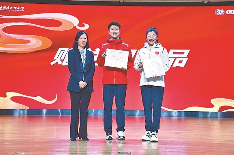 图③:“冠军来了”活动中,哈工大党委副书记、副校长陈蕊(左一)向王心迪和徐梦桃赠送纪念品。