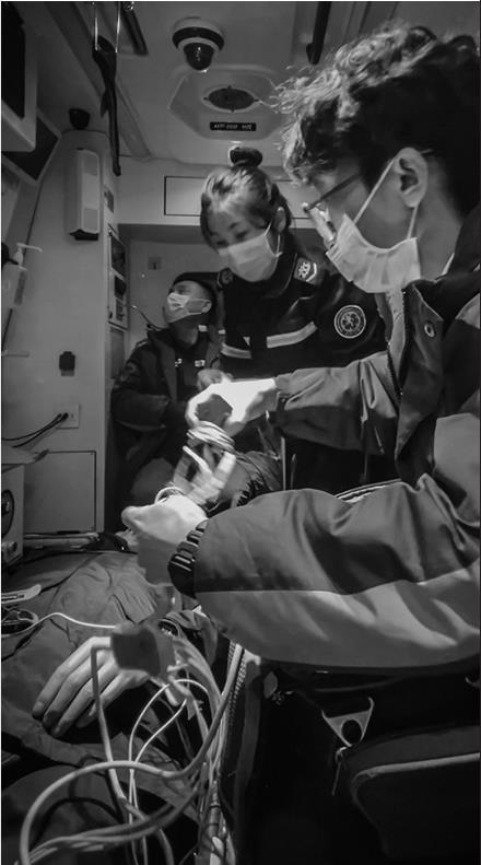 当班急救人员共有两组,急救车上除了院前急救医生郝迪,还有护士李慧,担架员王福民、薛国涛,驾驶员聂军。