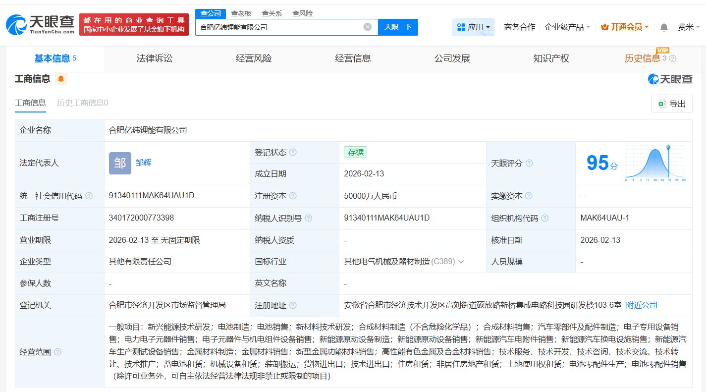 每经AI快讯,天眼查App显示,近日,合肥有限公司成立,法定代表人为邹辉,注册资本5亿元人民币,经营范围包括新兴能源技术研发、电池制造、电池销售等,由亿纬锂能(300014)全资持股。