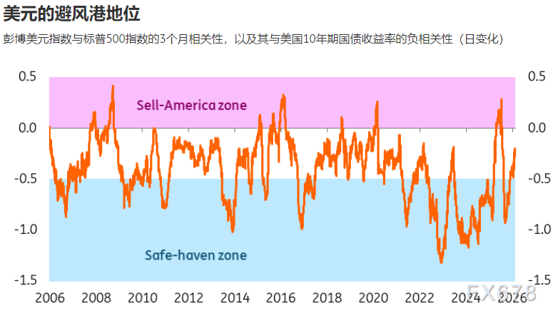 美元指数的避险溢价也出现了显著缩水,但这一变化仍属周期性波动,并未呈现结构性转向。通过彭博美元指数与标普500指数、10年期美债收益率的3个月相关系数差值可以刻画避险属性:该指标负值越高,说明美元指数在股市下跌、长端收益率上行时的避险表现越强。从实际数据来看,美元与标普500指数的3个月相关系数为-0.25,负值幅度虽弱于历史均值,但仍具备统计显著性,表明美元的避险属性并未完全消失。回顾历史走势,美元指数曾多次阶段性失去防御货币特征,因此理论上不能轻率将本次避险溢价缩水定义为结构性转变。