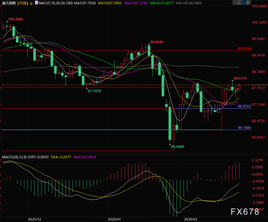 (美元指数日线图,来源:易汇通)北京时间20:25,美元指数现报97.91。