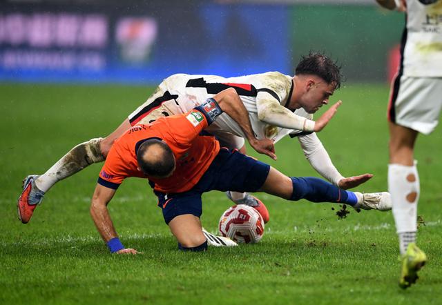 2025年10月17日 10月17日,上海海港队球员奥斯卡·梅伦多·希门尼斯(上)在比赛中与青岛海牛队球员萨里奇拼抢。 当日,在山东青岛举行的2025赛季中超联赛第27轮比赛中,上海海港队客场4比3战胜青岛海牛队。 新华社发