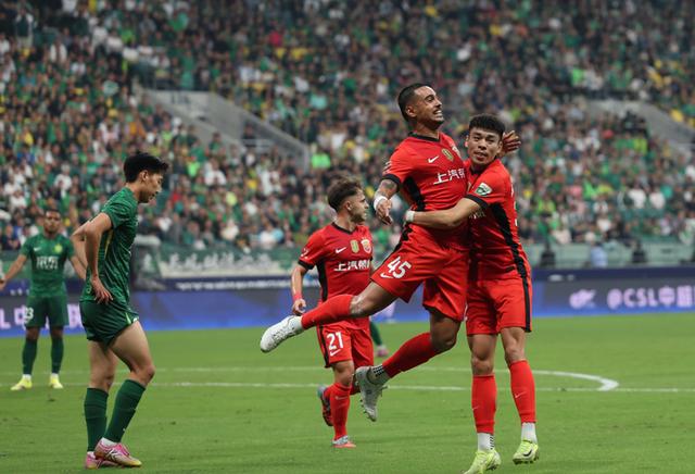 2025年9月21日,上海海港队球员莱昂纳多(右二)进球后庆祝。 当日,在北京工人体育场举行的2025赛季中国足球超级联赛第25轮比赛中,北京国安队主场2比3不敌上海海港队。 新华社记者 胡星宇 摄