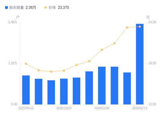 2月27日消息,数据显示,截至2026年2月13日,A股股东总户数为2.36万户,较上期(2026年1月30日)增加1.42万户,增幅151.84%。公司最新A股总股本为1.33亿股,其中流通A股6685.25万股,户均持有流通A股数量为2836.7股,较上期减少4307.19股,降幅60.29%;户均持流通A股市值6.63万元,较上期减少9.98万元,降幅60.09%。