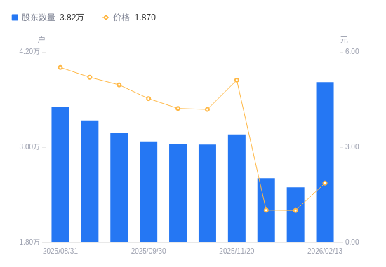2月25日消息,数据显示,截至2026年2月13日,A股股东总户数为3.82万户,较上期(2026年1月9日)增加1.32万户,增幅53.05%。公司最新A股总股本为6.42亿股,其中流通A股6.41亿股,户均持有流通A股数量为1.68万股,较上期减少8907.99股,降幅34.66%;户均持流通A股市值3.14万元,较上期增加5444.26元,增幅20.97%。