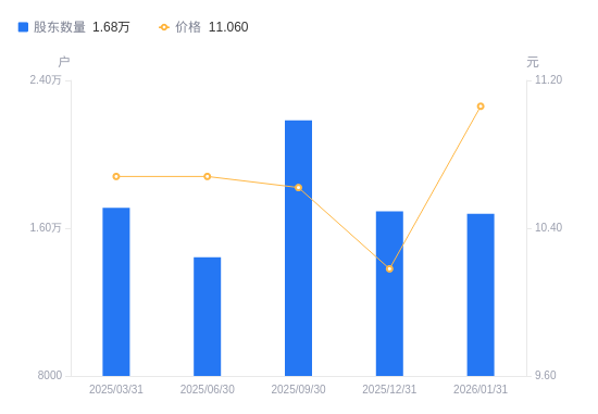 2月27日消息,数据显示,截至2026年1月31日,A股股东总户数为1.68万户,较上期(2025年12月31日)减少141户,降幅0.83%。公司最新A股总股本为2.3亿股,其中流通A股2.3亿股,户均持有流通A股数量为1.37万股,较上期增加114.3股,增幅0.84%;户均持流通A股市值15.17万元,较上期增加1.32万元,增幅9.56%。