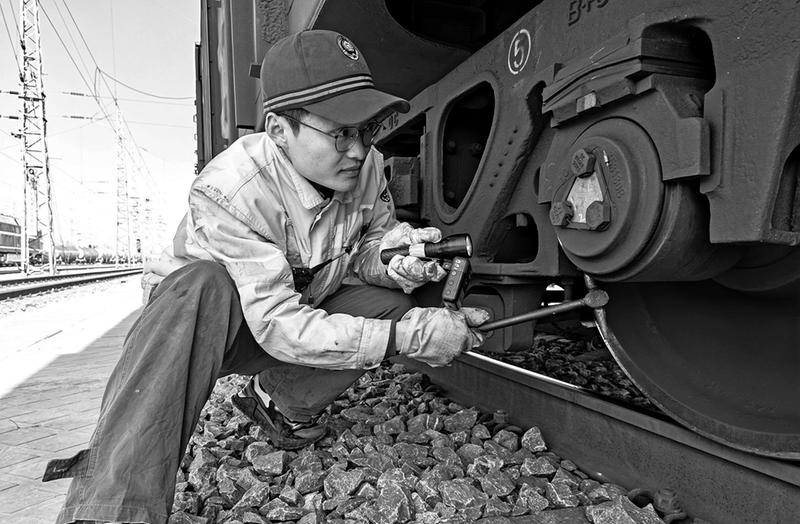 2019年入行的杨磊,已成长为“技术能手”和“火车头奖章”获得者。他曾在全国铁路货车检车员职业技能竞赛中夺得个人全能第八名,不仅练就一双识别故障的“火眼金睛”,更凭借敏锐的听觉揪出不少隐蔽性极强的安全隐患。“第13辆车运行时有‘咣当’声,多是车轮踏面损伤;第32辆车有‘吱吱’异音,一般是基础制动装置出现抗衡……”话音未落,对讲机里传来青工邹宇航的故障确认请求。杨磊快步赶到现场,用检查器仔细测量后判定:“踏面擦伤深度0.3毫米,不影响安全,做好记录就行。”