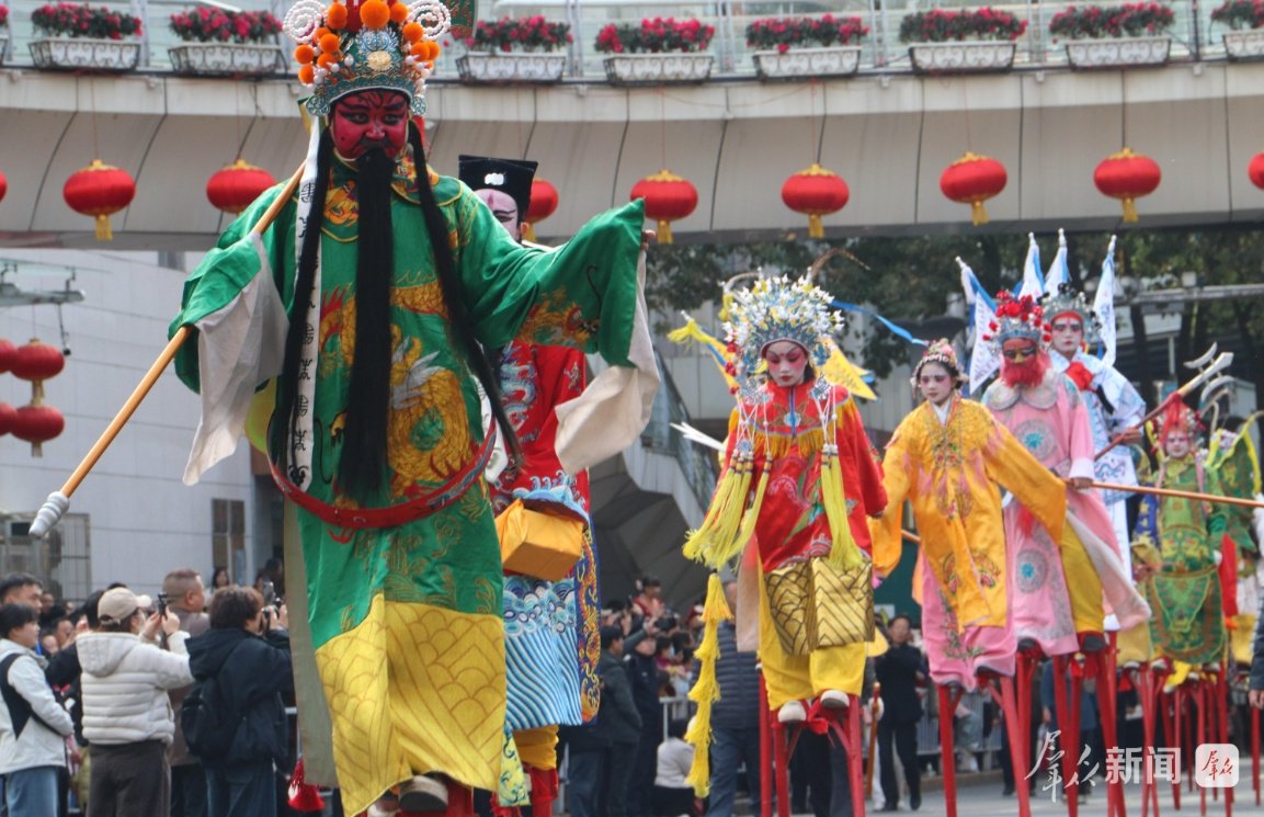 2月27日,演员在社火巡游中进行高跷表演。