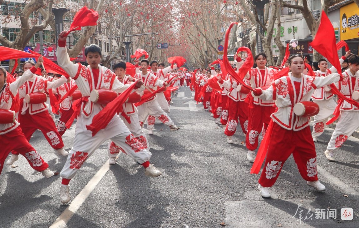 2月27日,演员在社火巡游中进行腰鼓表演。