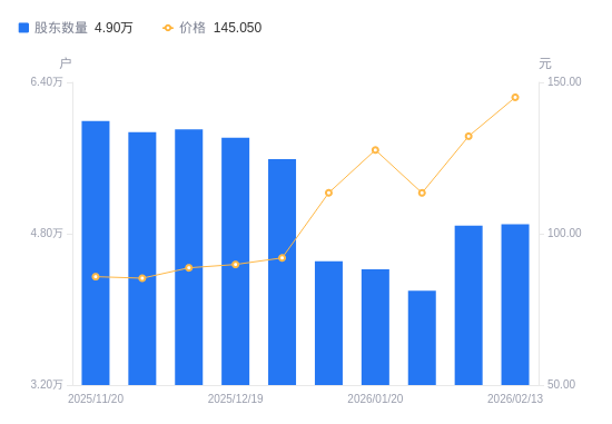 2月28日消息,数据显示,截至2026年2月13日,A股股东总户数为4.9万户,较上期(2026年2月10日)增加138户,增幅0.28%。公司最新A股总股本为2.65亿股,其中流通A股2.21亿股,户均持有流通A股数量为4513.85股,较上期减少12.75股,降幅0.28%;户均持流通A股市值65.47万元,较上期增加5.63万元,增幅9.41%。