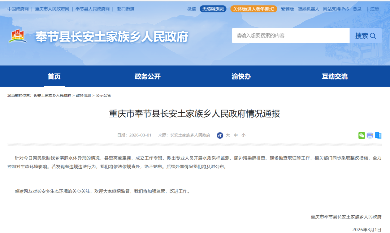 针对今日网民反映我乡溶洞水体异常的情况,县里高度重视,成立工作专班,派出专业人员开展水质采样监测、周边污染源排查、现场勘查取证等工作,相关部门同步采取整改措施,全力控制对生态环境影响。若发现有违规违法行为,我们将依法依规查处,绝不姑息。后续处置情况我们将及时公布。