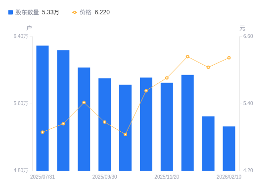 2月25日消息,数据显示,截至2026年2月10日,A股股东总户数为5.33万户,较上期(2026年1月20日)减少1210户,降幅2.22%。公司最新A股总股本为10.69亿股,其中流通A股10.66亿股,户均持有流通A股数量为2万股,较上期增加444.46股,增幅2.27%;户均持流通A股市值12.45万元,较上期增加6091.27元,增幅5.14%。